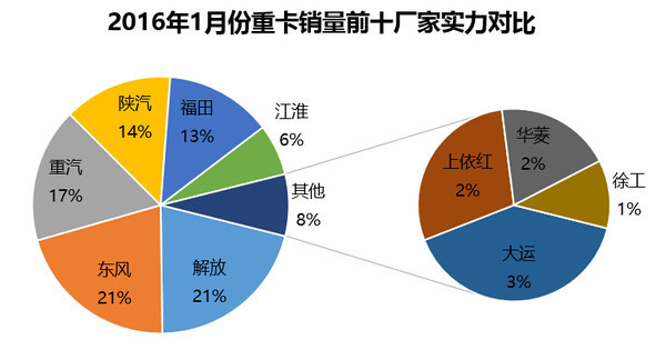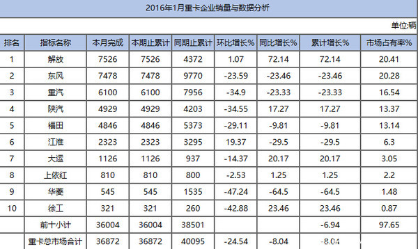 1月份重卡銷(xiāo)量前十名依次為解放、東風(fēng)、重汽、陜汽、福田、江淮、大運(yùn)、上依紅、華菱、徐工。前十廠商銷(xiāo)量占去整個(gè)重卡市場(chǎng)97.65%的比例,強(qiáng)者越強(qiáng)的效應(yīng)凸顯。其中,解放重卡銷(xiāo)量7526輛,同比上升72.14%,成為當(dāng)月銷(xiāo)量冠軍。第二名東風(fēng)銷(xiāo)量7478輛,同比下降23.46%;第三名重汽銷(xiāo)量6100輛,同比下降23.33%。