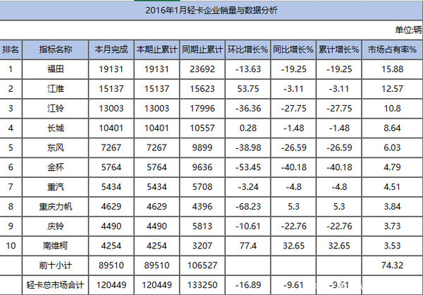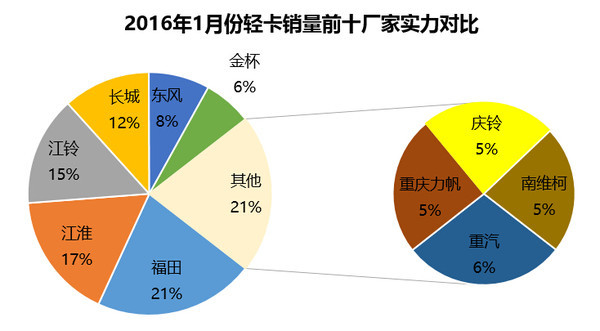 輕卡銷(xiāo)量前十廠商依次為福田、江淮、江鈴、長(zhǎng)城、東風(fēng)、金杯、重汽、力帆、慶鈴、南維柯。這十個(gè)廠商銷(xiāo)量占去74.32%的輕卡市場(chǎng)。其中前三位福田、江淮、江鈴合計(jì)占據(jù)39.25%的市場(chǎng),近四成的市場(chǎng)占有率。