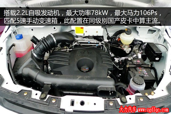 在傳動(dòng)系統(tǒng)方面,該車搭載了一臺(tái)2.2L自然吸氣發(fā)動(dòng)機(jī),最大功率可達(dá)78kW,最大馬力106Ps,傳動(dòng)系統(tǒng)均匹配5速手動(dòng)變速箱,這樣的配備在同級(jí)別國產(chǎn)皮卡中頗為主流。