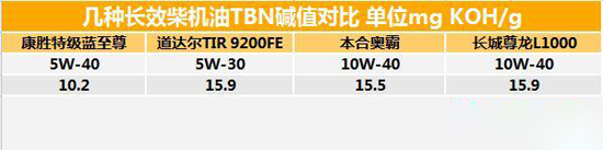 酸性氣體在柴油機(jī)工作過(guò)程中持續(xù)產(chǎn)生,所以機(jī)油什么時(shí)候酸化添加劑失效才是該換機(jī)油的重要指標(biāo)。所以長(zhǎng)效機(jī)油的TBN(總堿值)都會(huì)調(diào)配的略高。那么說(shuō)了半天,好像還沒(méi)講到這和加小油有什么關(guān)系,我們接著看這個(gè)表格。