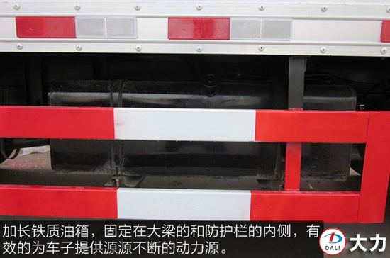 加長(zhǎng)鐵質(zhì)油箱,固定在大梁和防護(hù)欄的內(nèi)側(cè),有效的為車子提供源源不斷的動(dòng)力源。