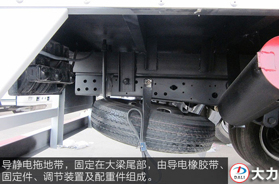導(dǎo)靜電拖地帶,固定在大梁尾部,由導(dǎo)電橡膠帶、固定件、調(diào)節(jié)裝置及配重件組成,為車輛的行車安全提供最基本的保障。