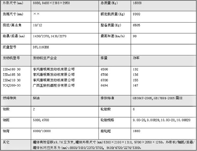東風(fēng)天錦灑水車最常用底盤為DFL1160BX ,軸距為5米,其配置為:4×2驅(qū)動(dòng),D530平頭一排半平頂駕駛室, ISDe210 30電控共軌發(fā)動(dòng)機(jī),軸距5000mm,帶電加熱(預(yù)熱塞)冷起動(dòng)裝置,全鋼160L燃油箱,電子油門踏板,消聲器排氣口向外(側(cè)吹),Φ395mm推式膜片彈簧離合器,東風(fēng)6檔DF6S900變速箱,頭檔速比6.938,最高檔為超速檔,6噸前橋,10噸后橋,主減速比5.571,無輪間差速鎖,部分功率(在變速箱上取力)取力器,車架斷面250×80×(7+4)mm,鋼板彈簧片數(shù)8/10+8,10.00-20斜交胎,自動(dòng)調(diào)整臂,無ABS,半浮式駕駛室后懸,液壓機(jī)械翻轉(zhuǎn),無色夾層前風(fēng)窗玻璃,電動(dòng)玻璃升降器,中控門鎖,通道式儀表板,帶空調(diào),有巡航系統(tǒng)。玉白。