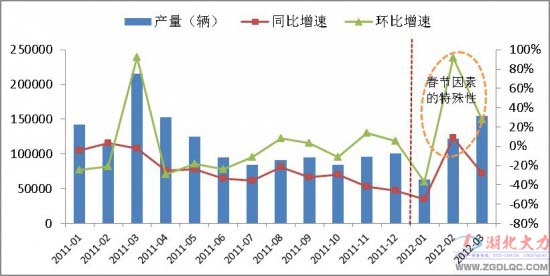 從第一季度各月份增長情況來看,與往年相比,一季度各月份比例存在著較大不同,其主要原因歸結(jié)如下:往年春節(jié)均在2月份,而今年的春節(jié)提前11天至1月,使得原本2月份產(chǎn)銷量均較低的情況提前至1月;元旦假期是另一個主要原因,1月工作日僅有17天,使得今年1月份的產(chǎn)量同比、環(huán)比增幅均呈現(xiàn)出較大幅度下降;相比之下,2月份由于工作日較往年多,同比、環(huán)比均呈現(xiàn)出較大幅度的增長。圖1為2011年以來專用汽車的月度走勢圖。