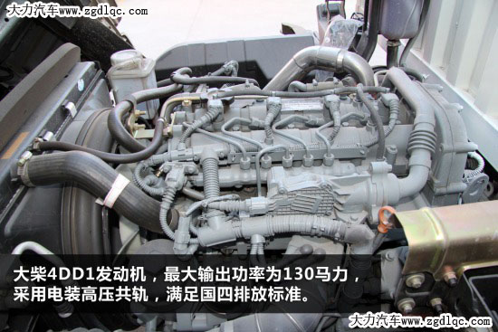 動(dòng)力方面,發(fā)動(dòng)機(jī)為采用道依茨技術(shù)的大柴4DD1發(fā)動(dòng)機(jī)CA4DD1-13E4R,4缸16氣門(mén),雙頂置凸輪軸設(shè)計(jì),輸出功率為130馬力。動(dòng)力強(qiáng)勁、節(jié)油性能突出。4DD1發(fā)動(dòng)機(jī)采用電裝電控高壓共軌系統(tǒng),EGR后處理系統(tǒng)帶POC+DOC顆粒捕捉器,滿(mǎn)足國(guó)四排放標(biāo)準(zhǔn)。